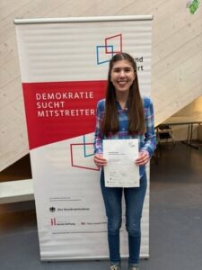 Mit Clara Jäger hat sich direkt bei der ersten AMS – Teilnahme eine Schülerin unserer Schule durchsetzen können. Sie erhielt damit eine Einladung zum Landesfinale in Wiesbaden, wo sie am 02. April im Hessischen Landtag die finalen Debatten der Erst- und Zweitplatzierten mitverfolgen darf.